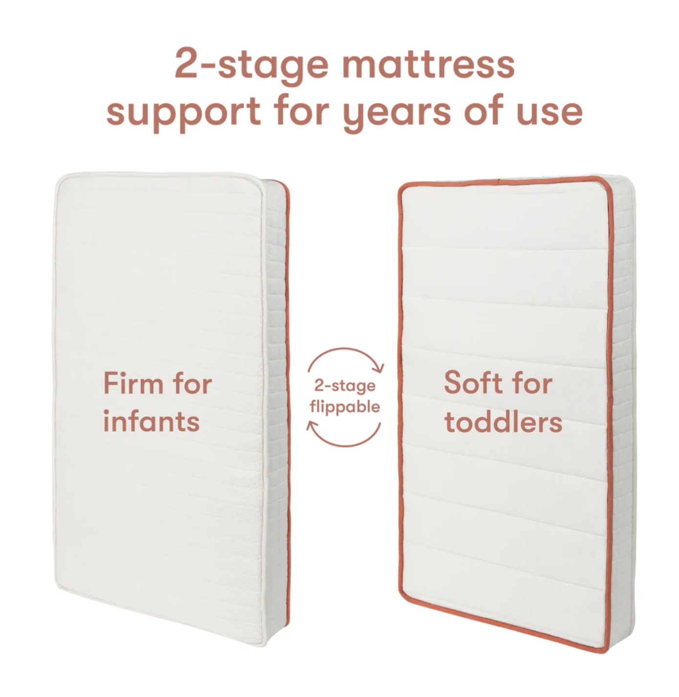 • 2-STAGE DESIGN: This 2-stage dual-sided mattress features a firm side for infants and a softer side for toddlers, providing endless support and comfort as your child grows. Our infant side features crisp white piping and neatly tailored channel stitching, while the toddler side showcases our signature terracotta color piping with wider, more pronounced channels.