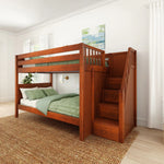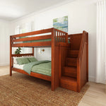 Built-in storage stairs and our full bunk bed make an excellent combination for shared rooms and vacation homes. Our Classic Full Bunk Bed with Stairs offers strength, durability, and longevity. Double your space’s sleep capacity without any floor space sacrifices. Constructed from high-quality hardwoods like aspen, maple, and birch, this timeless full-size bunk bed holds 800 pounds per bed (as supported by internal testing). It’s the superior choice for a secure, safe, reliable bunk bed that can comfortably sleep anyone. Built-in stair storage drawers keep extra bedding, clothes, and treasures organized and hidden. Our wooden bunk beds come in three height options to fit in different rooms and accommodate younger kids and adult guests. Stretch out and stay cozy in this full-size wooden bunk bed for years to come.