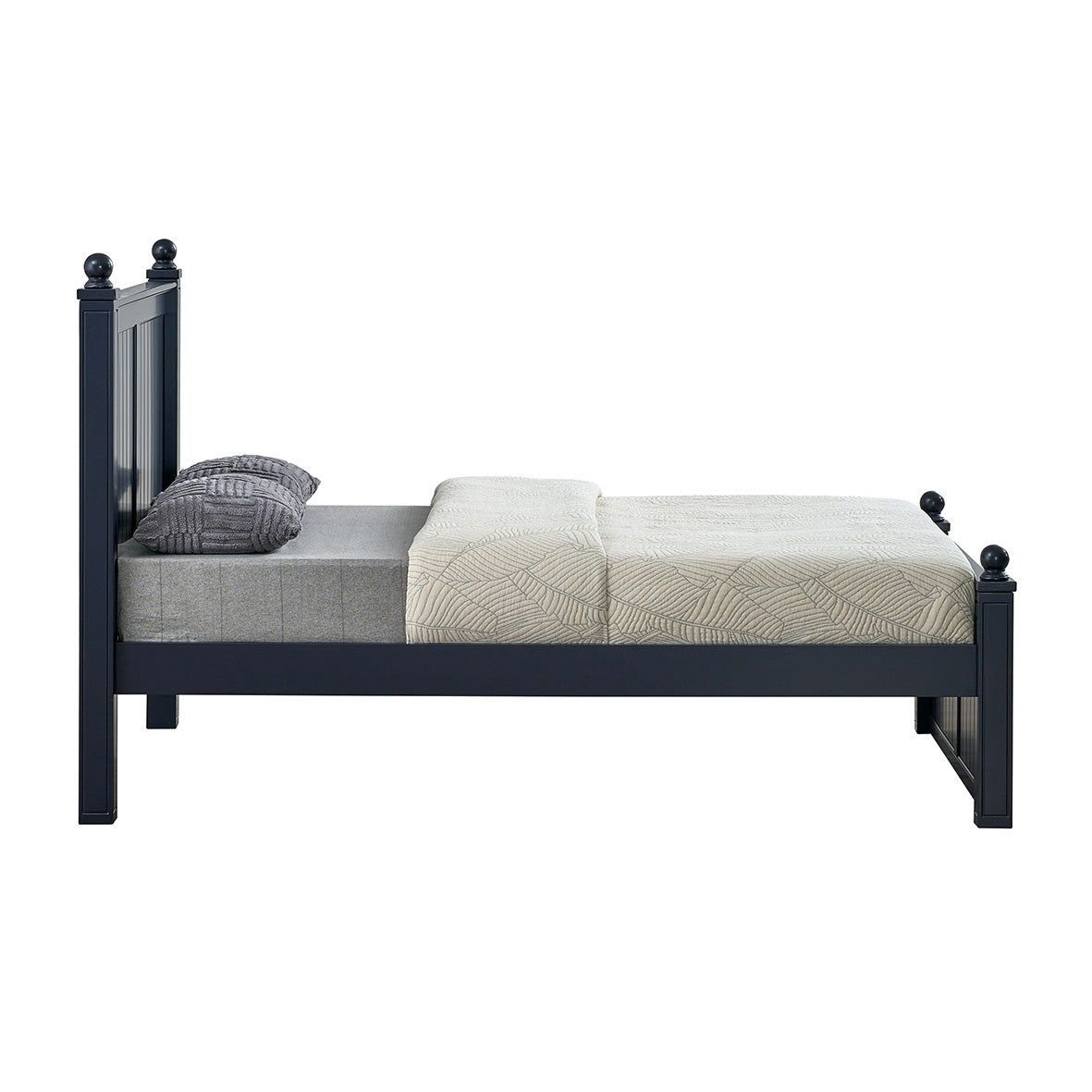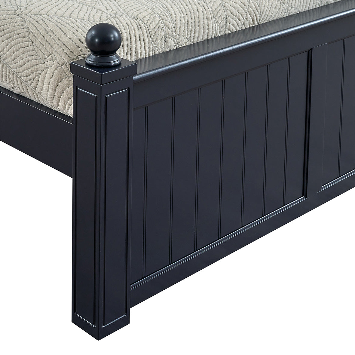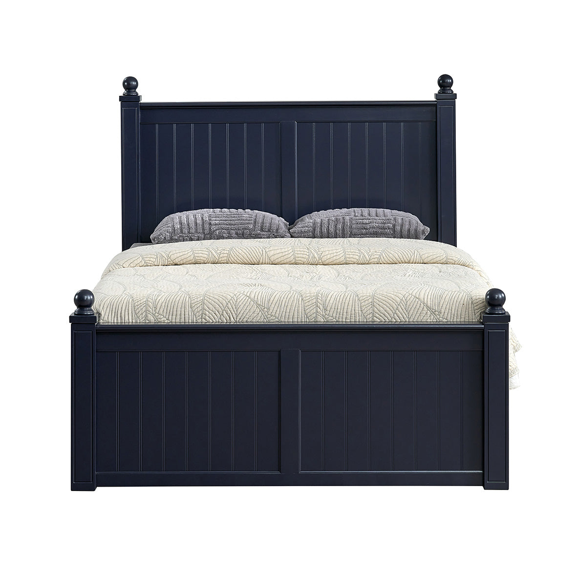 This full bed provides versatile sleeping and storage solutions, offering the choice of two under-bed drawers or a convenient trundle. Featuring 3.25" solid wood posts, the bed can be finished with decorative finials or plugs to suit your customer’s style. Its beadboard design blends modern aesthetics with timeless appeal, making it a classic addition to any bedroom. Built with sturdy construction and practical features, this bed delivers both functionality and style — a durable, high-quality option for retailers and their customers.
