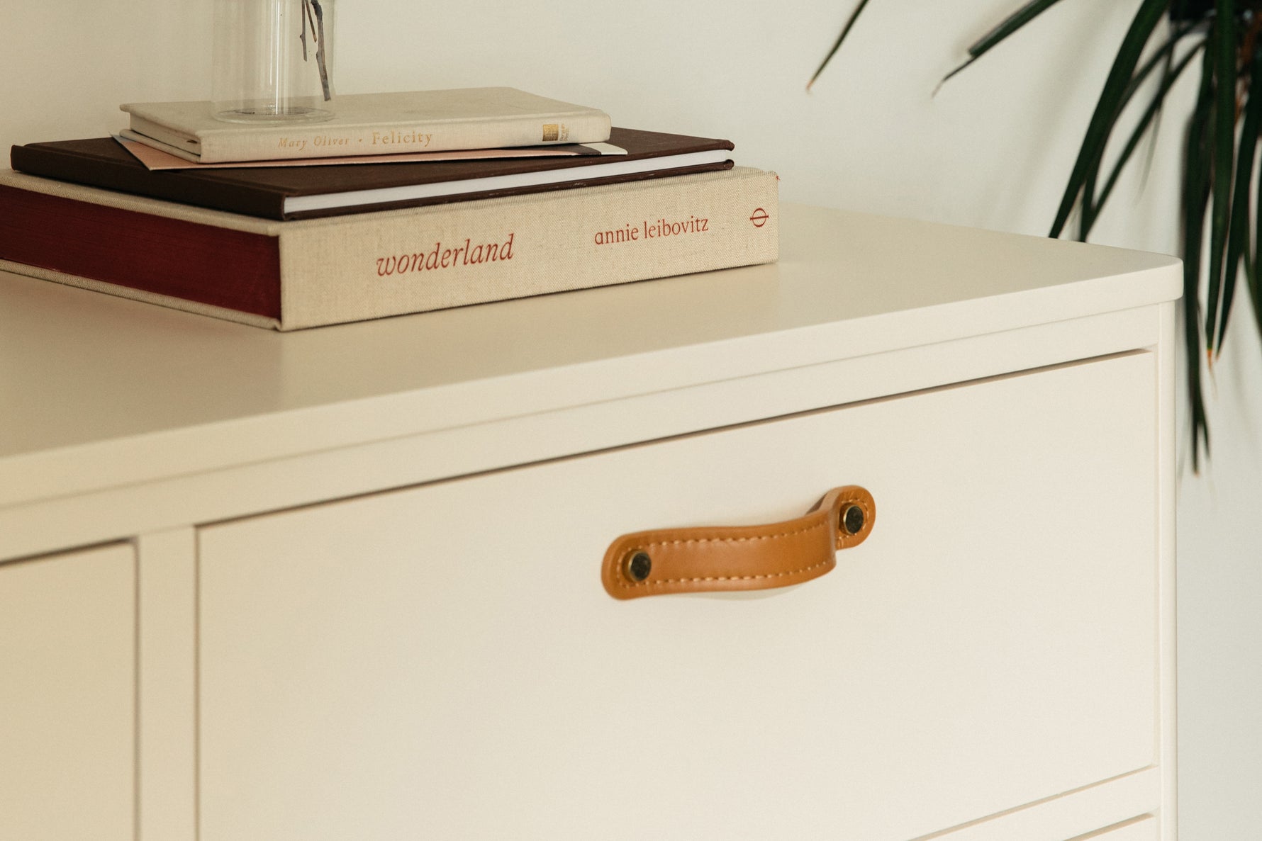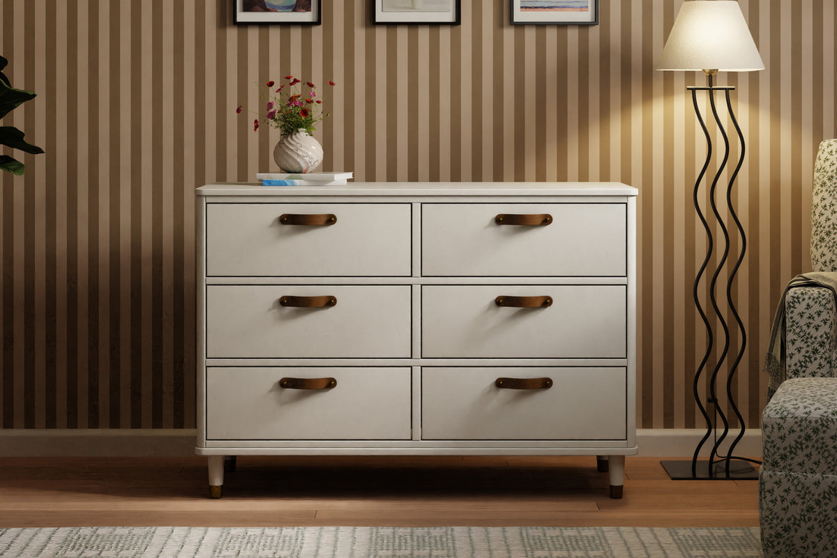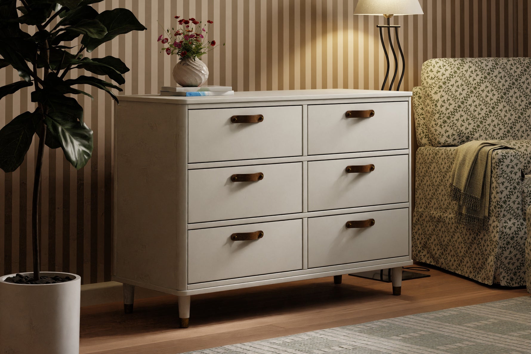 The classic inspired Tanner 6-Drawer Dresser is a contemporary take on a traditional piece. With unique details such as leather handles and elegant bronze metal feet caps, the Tanner is the perfect accent piece for all your storage needs. The six spacious drawers are built with dovetail construction and ball-bearing drawer glides. Available in a Warm White finish.