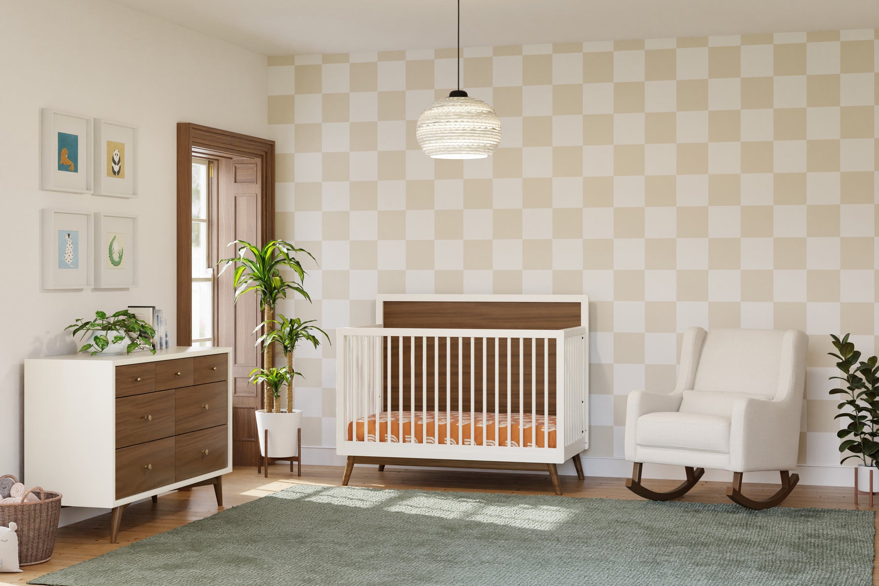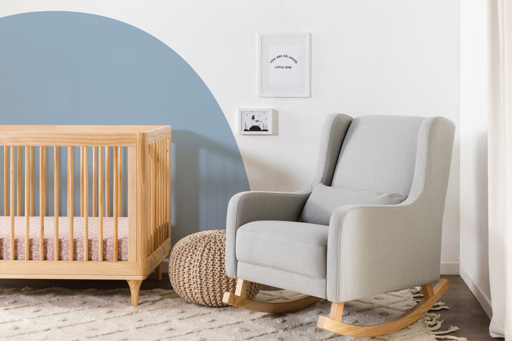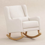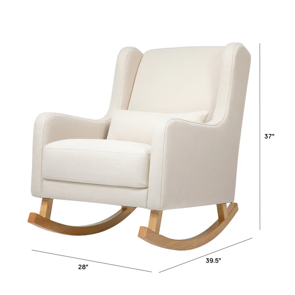 Take a moment to relax in the charming mid-century styled Kai rocking chair. Designed with modern rounded edges, curved rubberwood legs, and included lumbar cushion for added comfort. It's a stylish but also more sustainable choice for the modern nursery. Upholstered by hand in our eco-performance fabric, that is stain resistant, water repellent, and made with at least 30% recycled fibers.