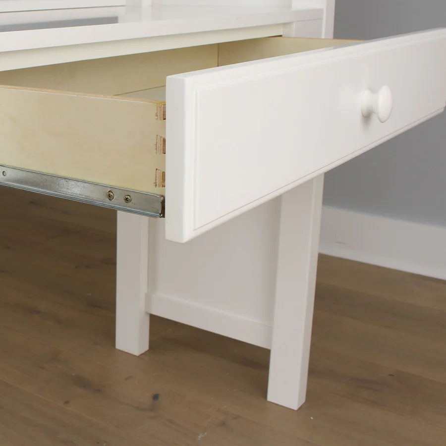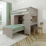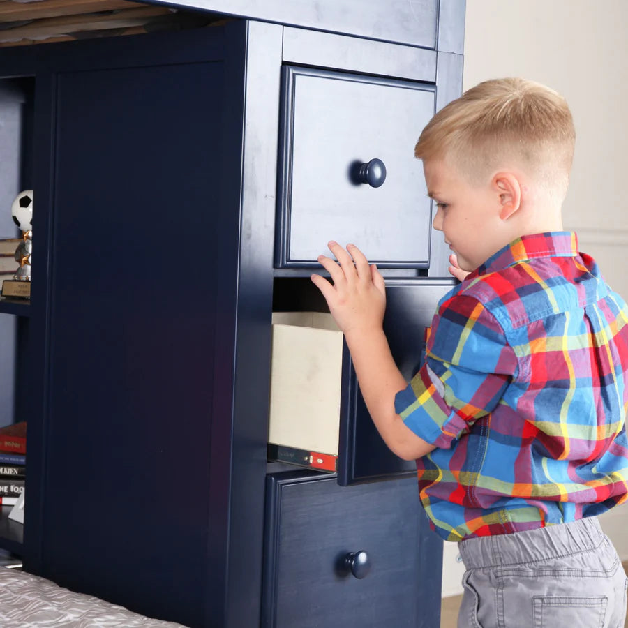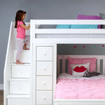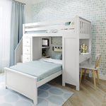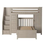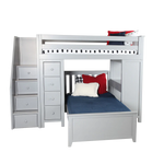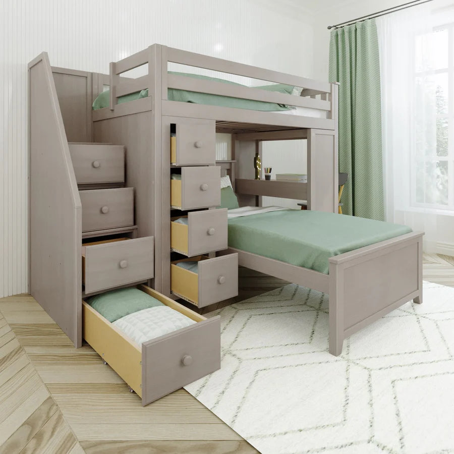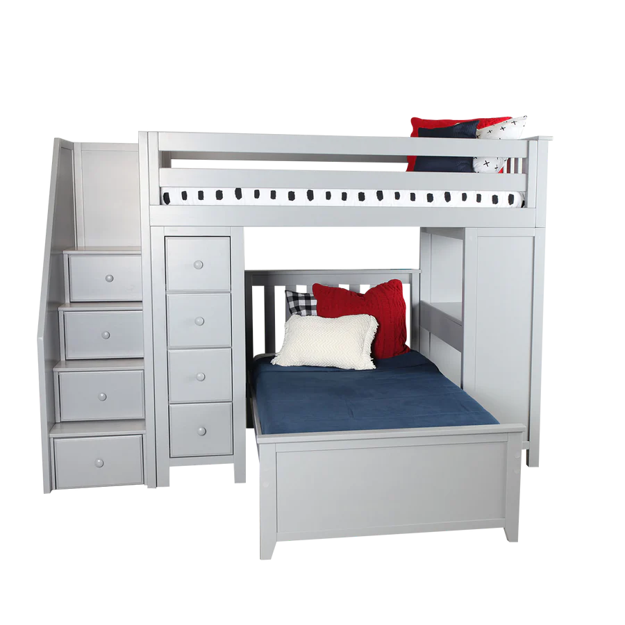 Sleep/Storage Solution - Twin Staircase Loft with built in drawers. Towers combine desk & 4 roomy front-facing drawers with 3 book shelves behind it. Twin Bed fits L-Shaped under Loft. Solid knot free Pine construction with flush, color coordinated hardware creates a clean & modern look. Oversized steel hardware ensures solid connections. Each bed tested for 400lb to comfortably sleep kids or adults. Pre-assembled components for fast & easy assembly. 15" guardrails accommodate standard mattresses (slat rolls included). Recommended for 8 feet ceiling height above. This bed meets or exceeds federal safety standards. Mattress, Cork board for desk & bedside tray sold separately..
