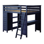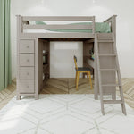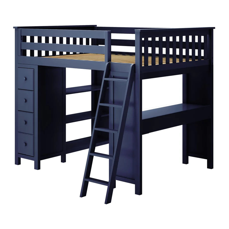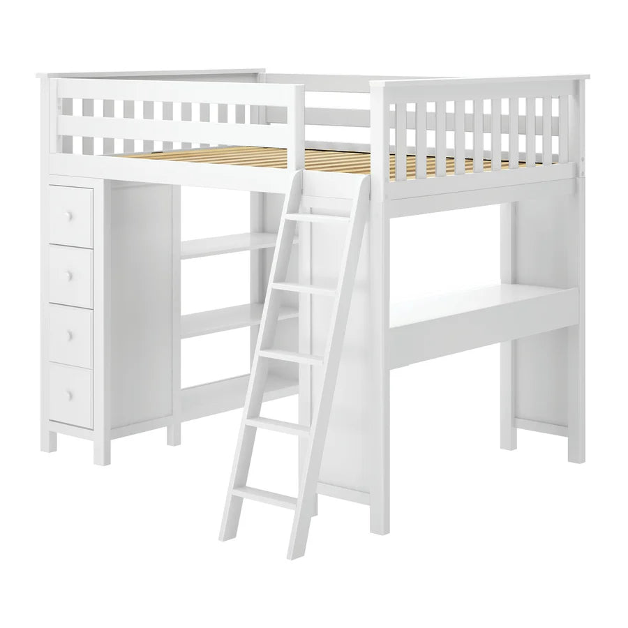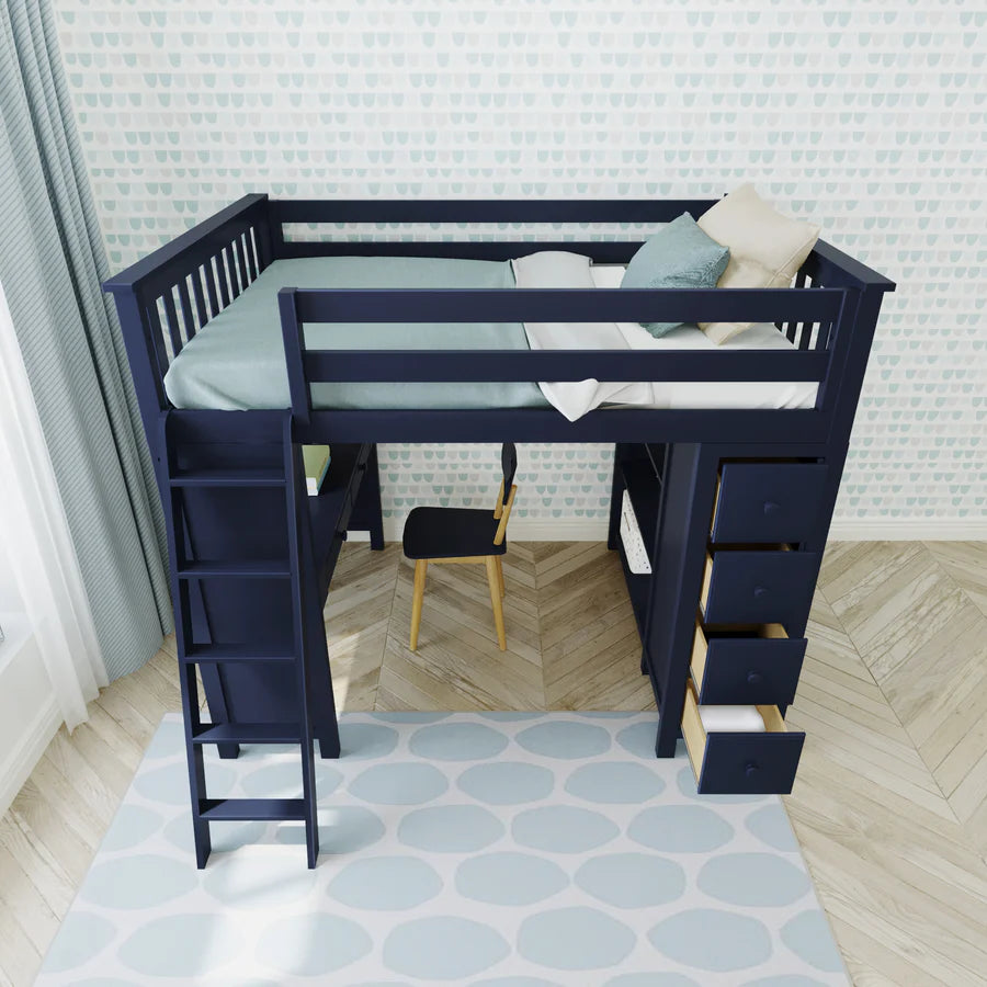 Made to store all your essentials, the Mayfair Loft Bed is the ideal sleep, study solution for your space. A desk with two drawers offers the perfect place for studying. Made to be both stylish and versatile, this desk can be assembled on either side of the bed for the ultimate space-saving design. Safety comes standard with extra tall 15 inch guardrails. Storage is made simple thanks to a storage tower with extra-long shelves. The reversible ladder with rounded edges and grooved treads makes climbing up easy and comfortable. This loft bed's raised design maximizes your space by opening up room underneath for an additional storage or lounge area. Crafted with solid, knot-free New Zealand pine wood and strong metal-on-metal connections, this bed's  frame offers sturdy support for years to come. Feel safe and secure with solid plywood slats and a metal support bar that offer a high 400 lb. resting weight capacity per sleeping surface. The beautiful slatted headboard and flush, color-matched hardware create a modern look. Durable, non-toxic low VOC finishes make this bed the clean, healthy choice for your home. Combining superior quality with classic design, this Loft with Desk + Storage is the perfect all-in-one choice for every room.