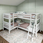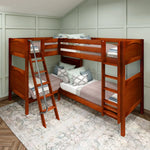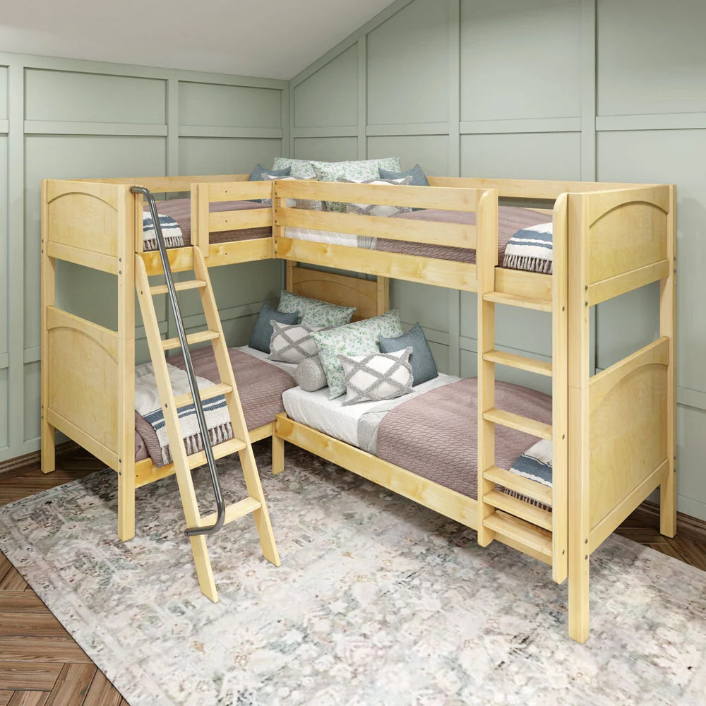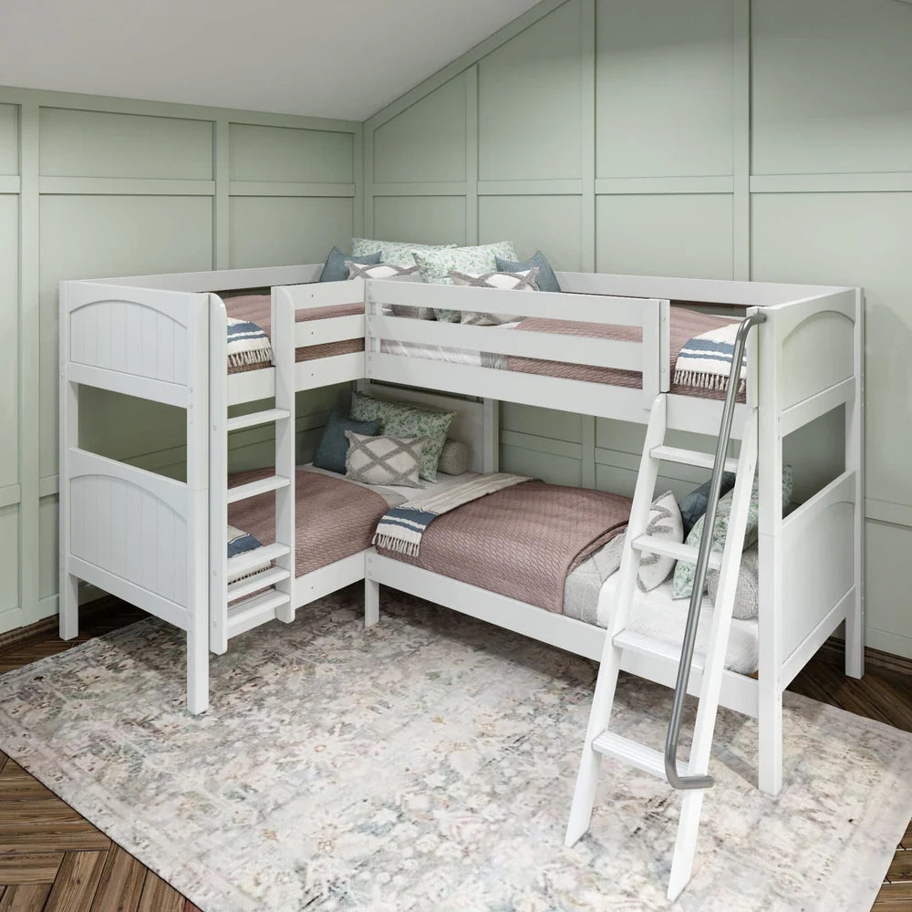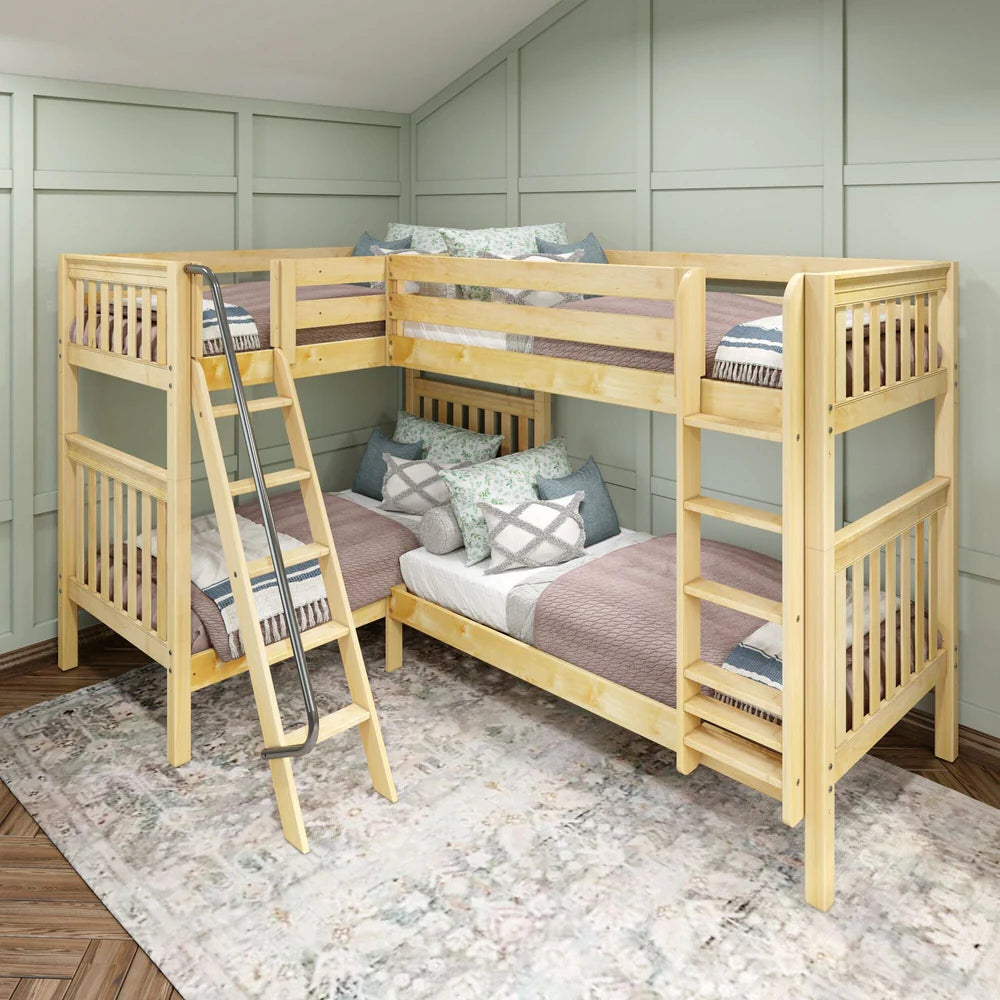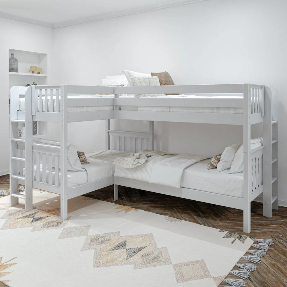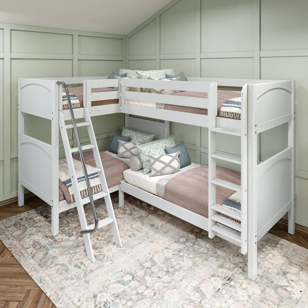 • Unique Corner Configuration: Designed to fit perfectly in the bedroom corner, this L-shaped bunk bed setup is an easy way to sleep four. This quadruple corner bunk bed is an incredible shared room solution that maximizes floor space to sleep more people and frees up space for additional furniture for storage or lounging. Each top bunk has its own ladder for hassle-free climbing.
