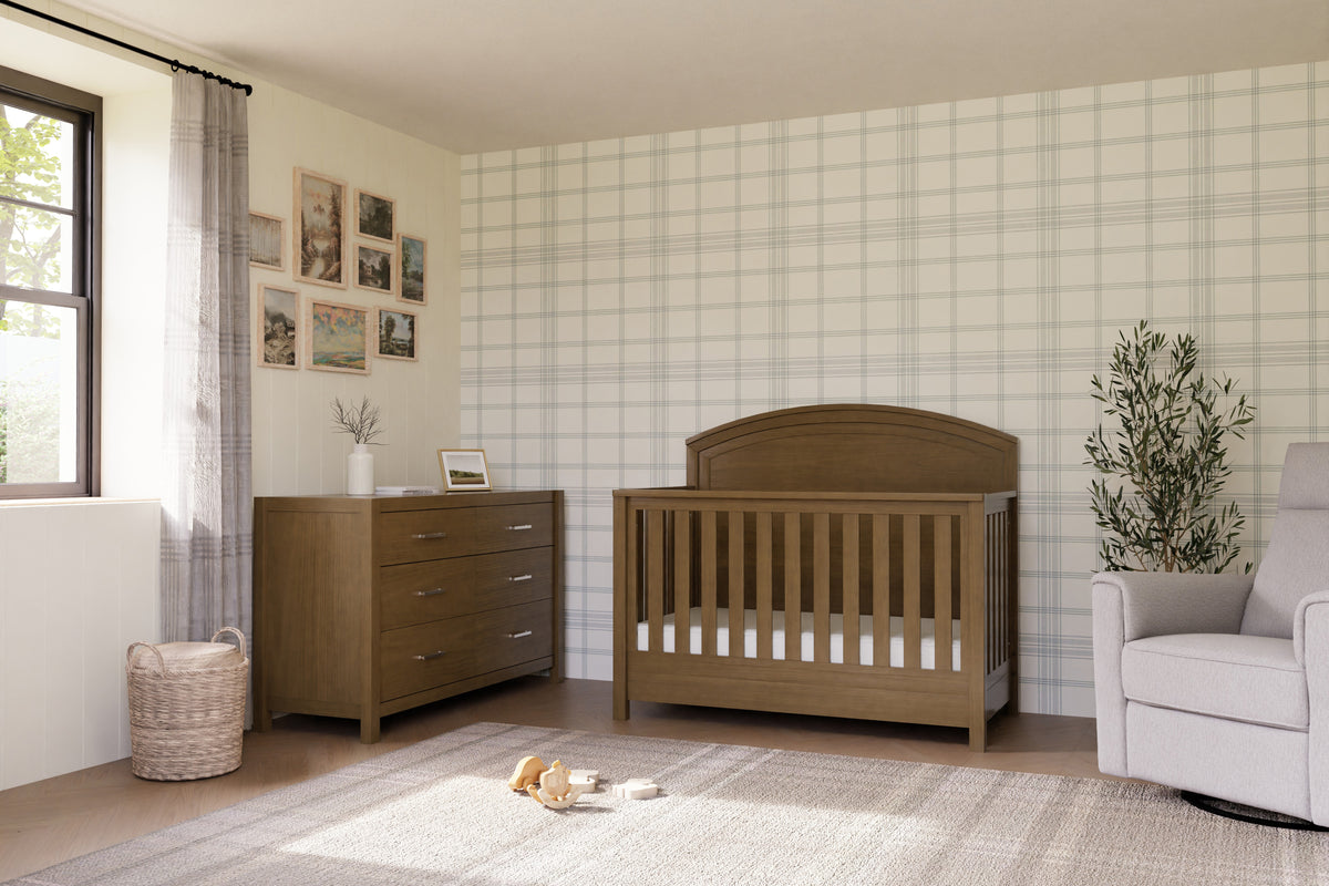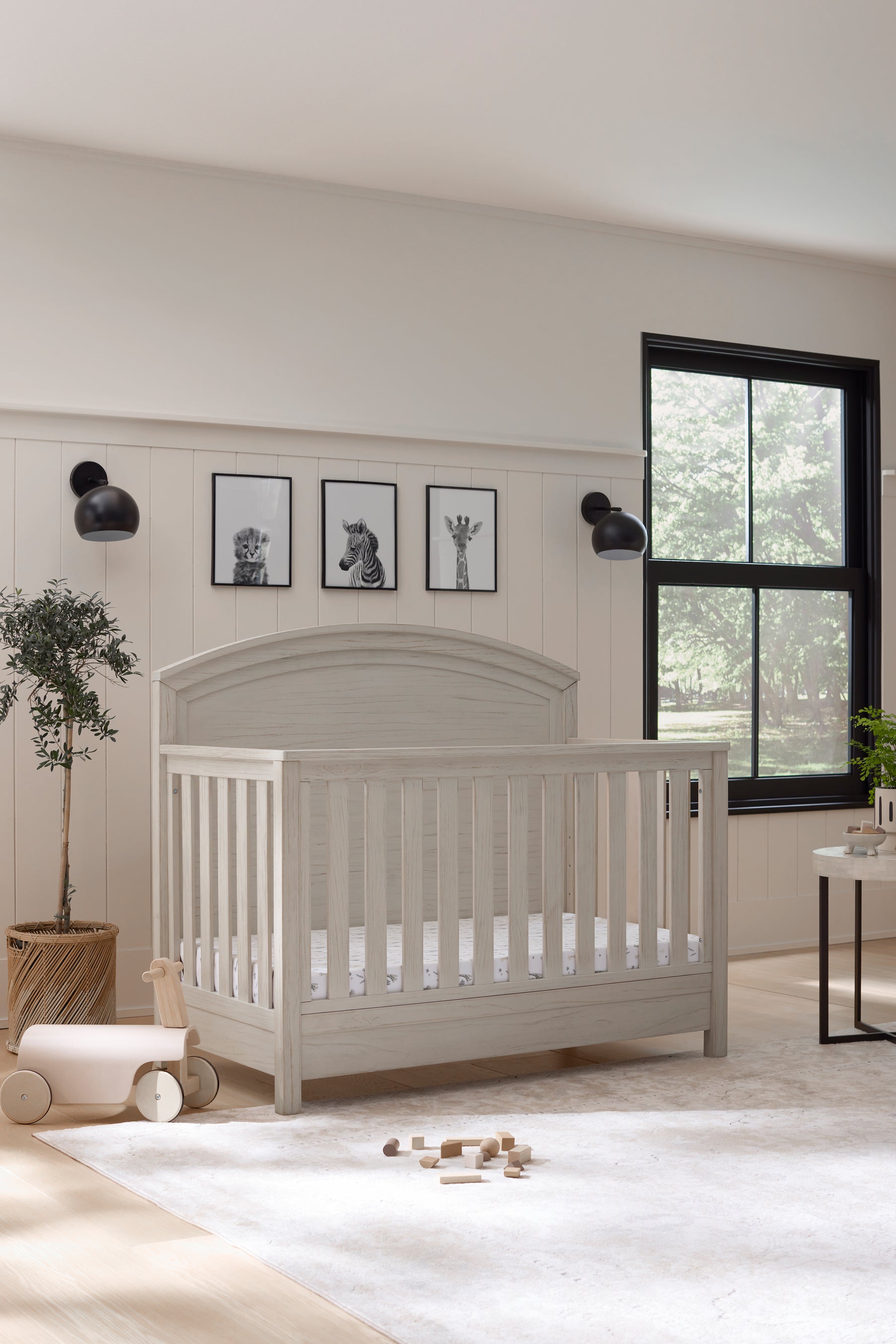 Lean into the modern farmhouse aesthetic with the Hemsted 4-in-1 Convertible Crib. Featuring a beautifully textured finish, clean silhouette, and traditional curved headboard, this crib will perfectly complement your home. Built to seamlessly transition from newborn to toddler, the crib has four different mattress heights and easily converts to a toddler bed, daybed and full-size bed. Complete your nursery with the Hemsted 6-Drawer Dresser.