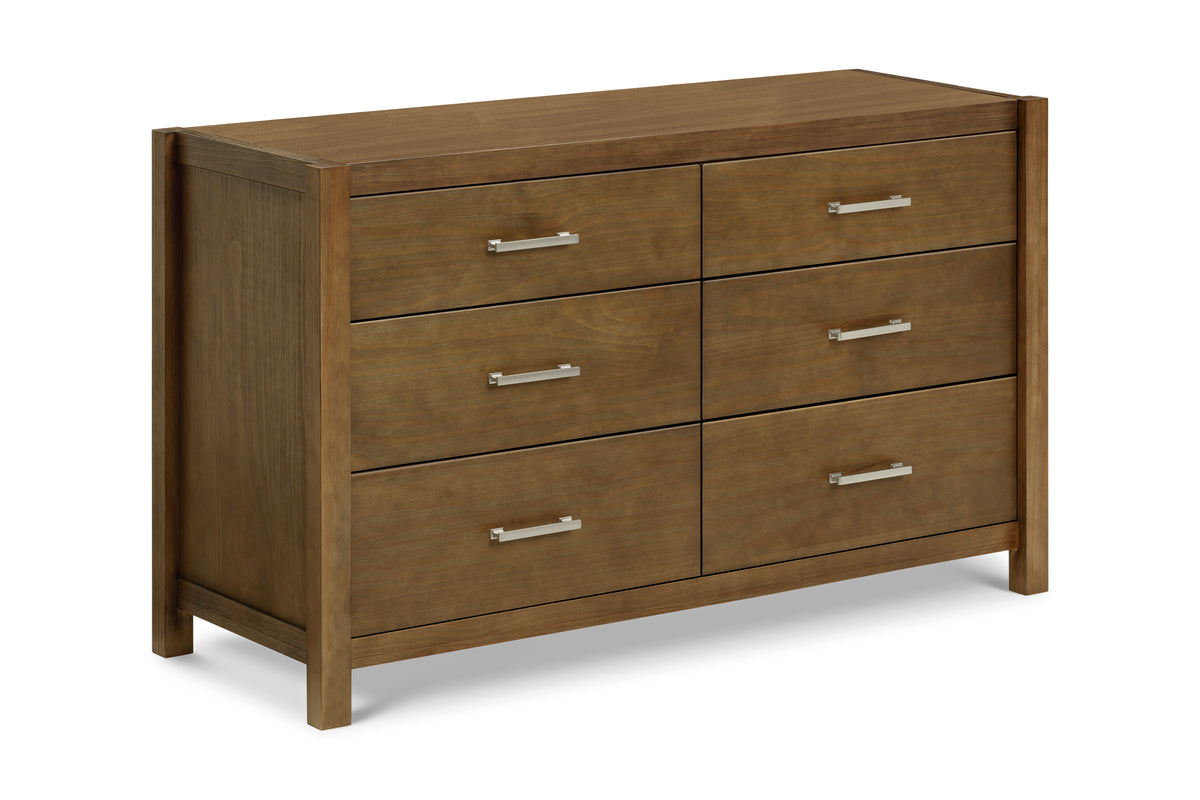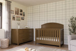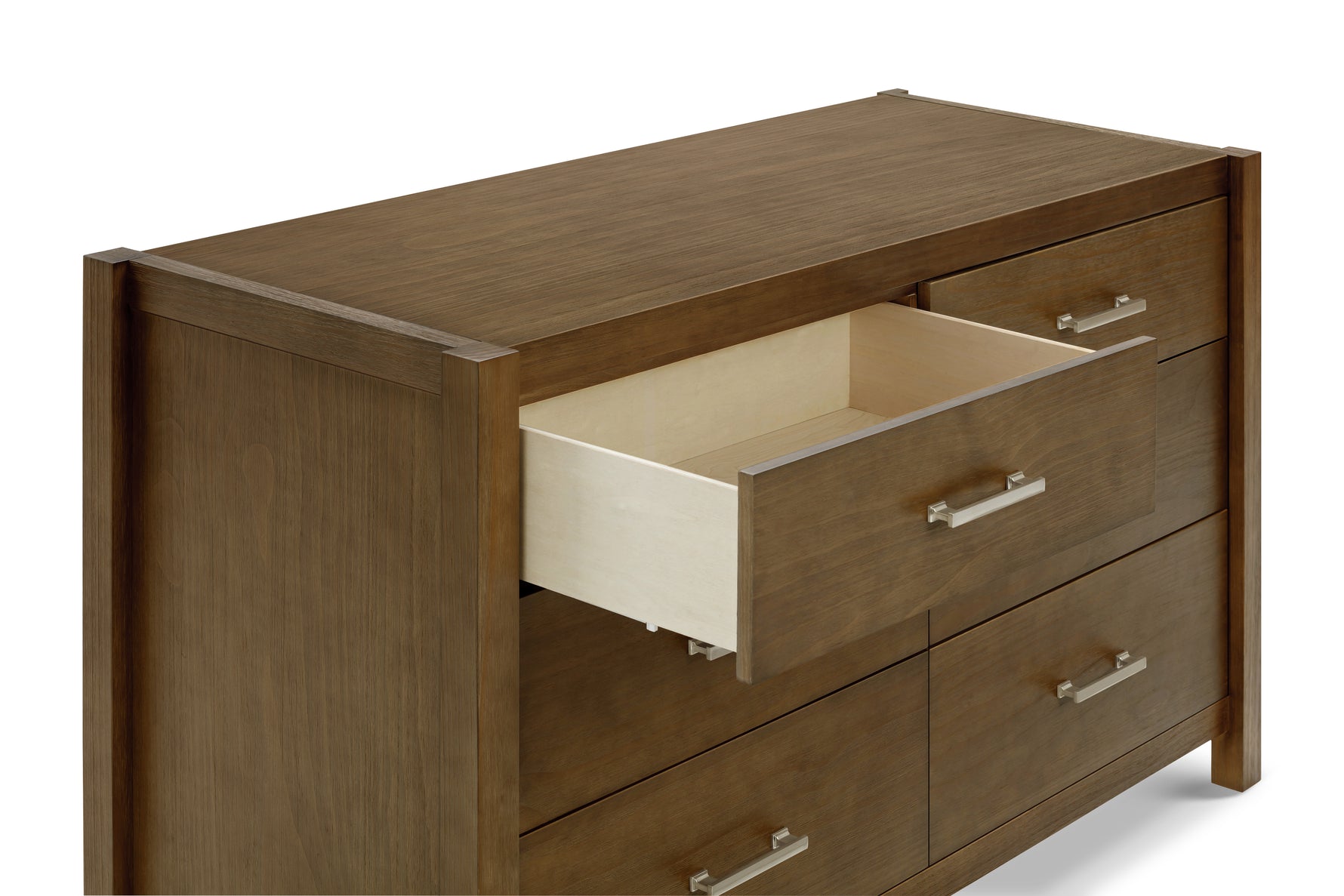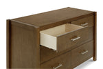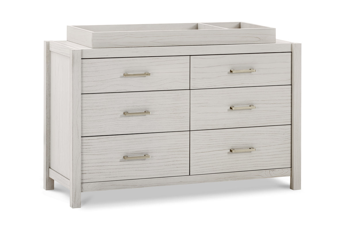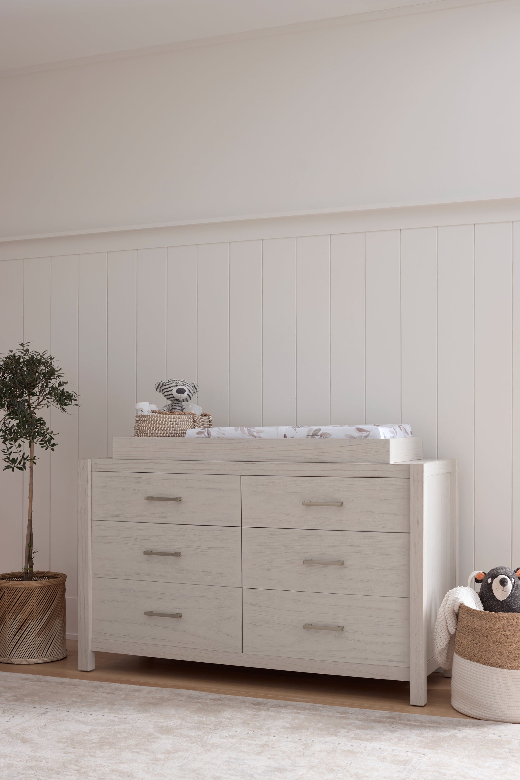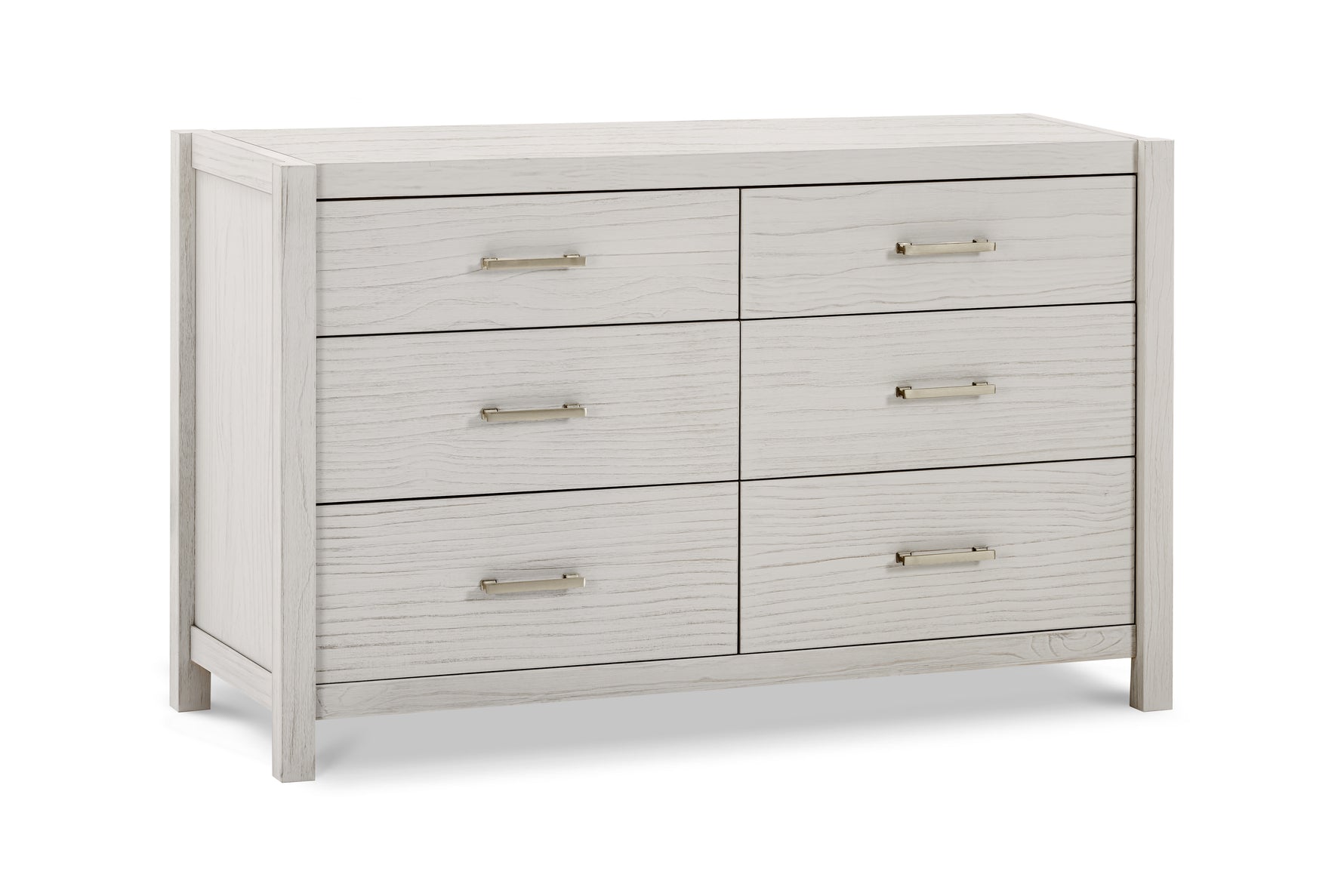 Complete your modern farmhouse nursery with the Hemsted 6-Drawer Dresser, featuring a premium texturized wood finish and elegant gold hardware that enhances the dresser's contemporary flair. Soft-closing, ball-bearing drawer glides make this dresser easy to use.
