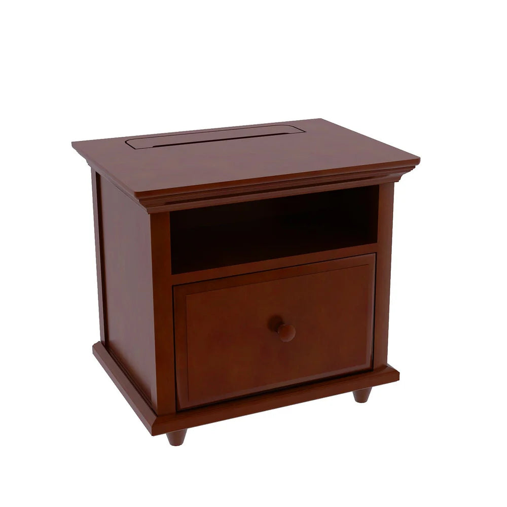 We made our bedside storage even more functional with our Nightstand with a built in Charging Station. Crafted with a solid hardwood frame and drawer fronts, this nightstand offers enhanced strength and stability. Strong engineered wood and beautiful hardwood veneers make each drawer bottom and side panel durable for everyday use. A storage drawer and shelf provide plenty of room to organize books and other favorite bedtime items. Drawer is soft close to keep kids' fingers safe. Includes a charging station with two outlets to power your computer, phone, or nightstand light.
