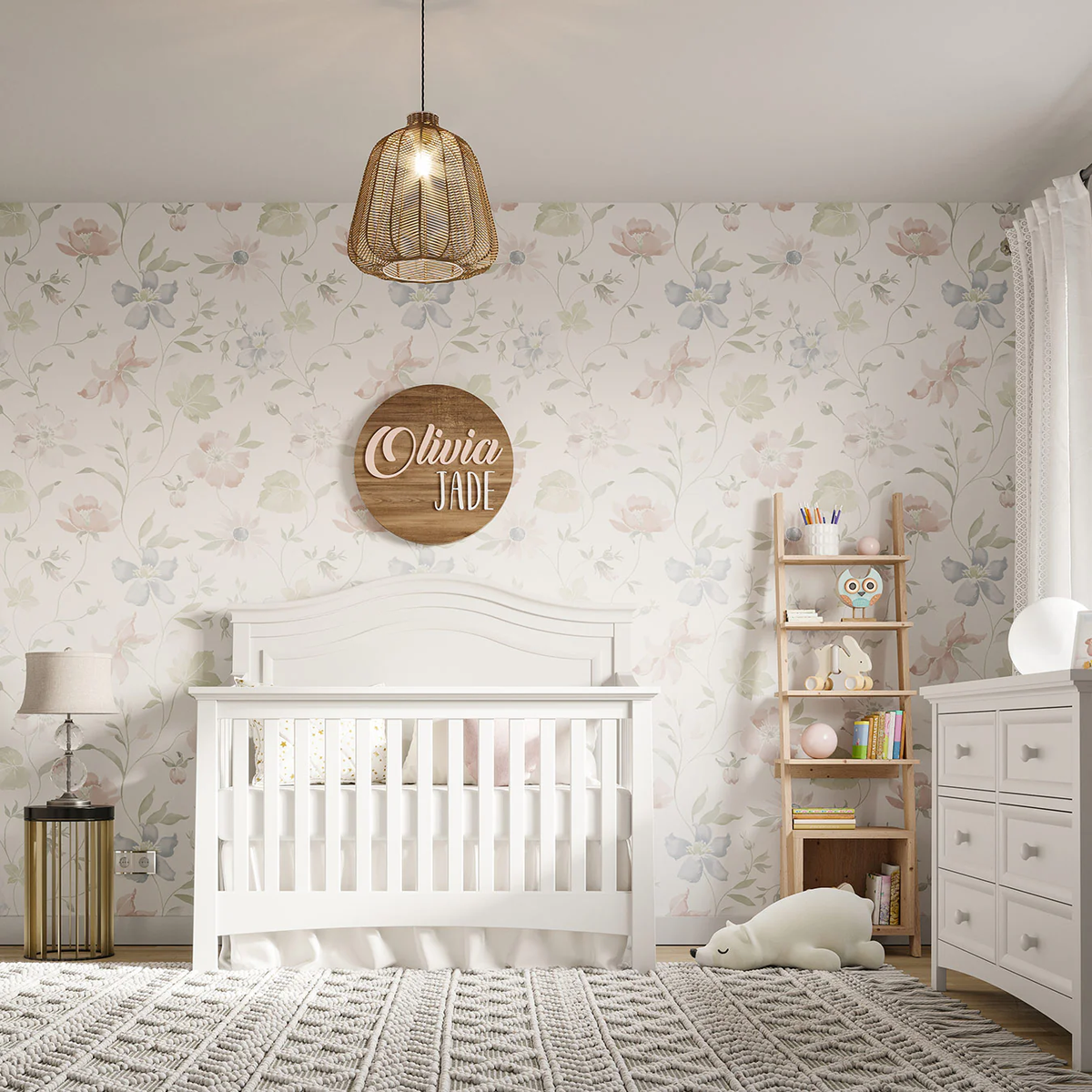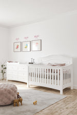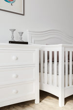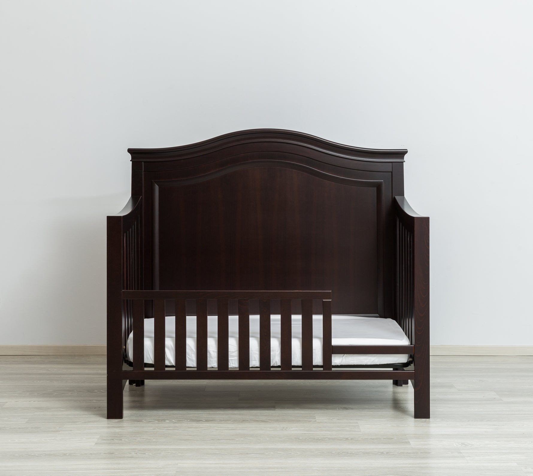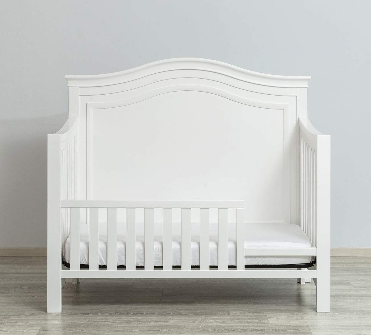 Serena is the instant classic, the design that grows on you. Arched headboard with subtle curves and perfect proportions, this 4 in 1 Convertible Crib transforms into a full size bed. Solid wood construction, finished with organic, non-toxic paints and stains.