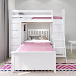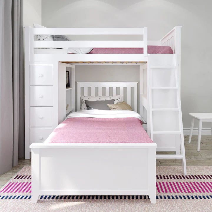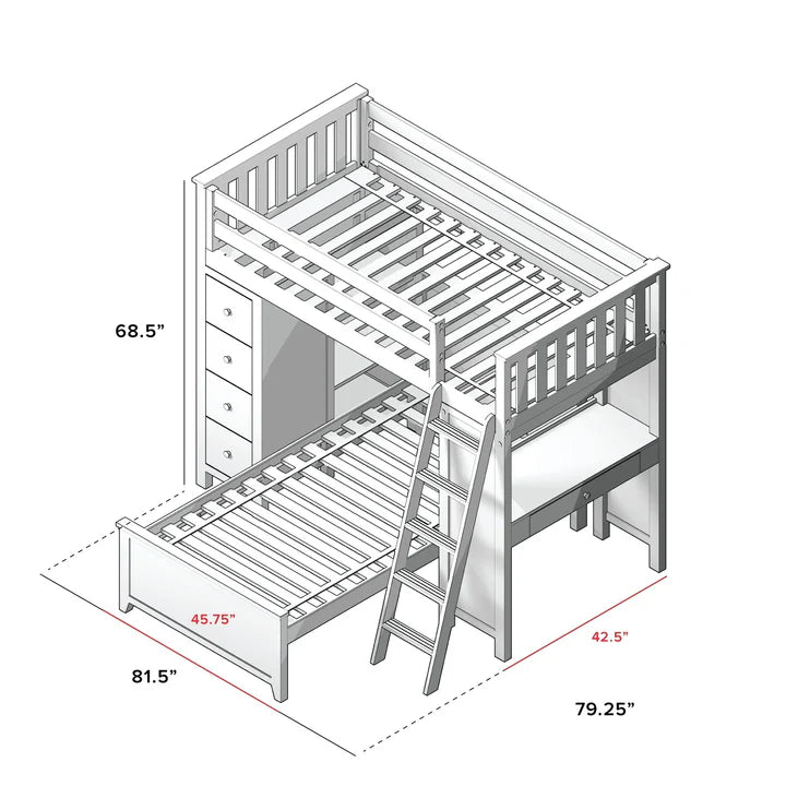 Sleep/Study/Storage Solution - Twin loft with built-in storage towers combine desk & 4 roomy front-facing drawers with 3 book shelves behind it. Twin Bed fits L-Shaped under Loft. Solid knot free Pine construction with flush, color coordinated hardware creates a clean & modern look. Oversized steel hardware ensures solid connections. Each bed tested for 400lb to comfortably sleep kids or adults. Pre-assembled components for fast & easy assembly. 15" guardrails accommodate standard mattresses (slat rolls included). Recommended for 8 feet ceiling height above. This bed meets or exceeds federal safety standards. Mattress, Cork board for desk & Bedside tray sold separately.