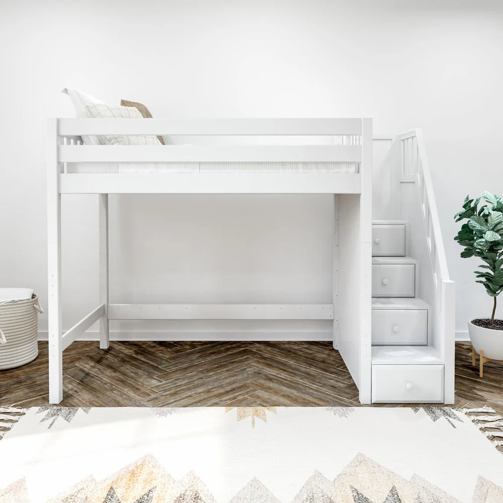 Our unique High Loft Bed with Stairs design is the solution to your space and storage needs. A higher loft height offers more floor space for storage, lounging, playing, or homework. Keep clothes, extra bedding, and treasures organized and hidden in our built-in stairs' storage drawers. With a weight capacity ranging from 800 pounds for twin and full beds to 2,000 pounds for twin XL and queen beds (as supported by internal testing), this high loft bed allows anyone to sleep up high comfortably and securely. Thanks to our patented Rock Lock™ technology that minimizes wobbling and industry-leading guardrail height, feel protected and peaceful for every night’s sleep.